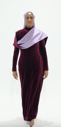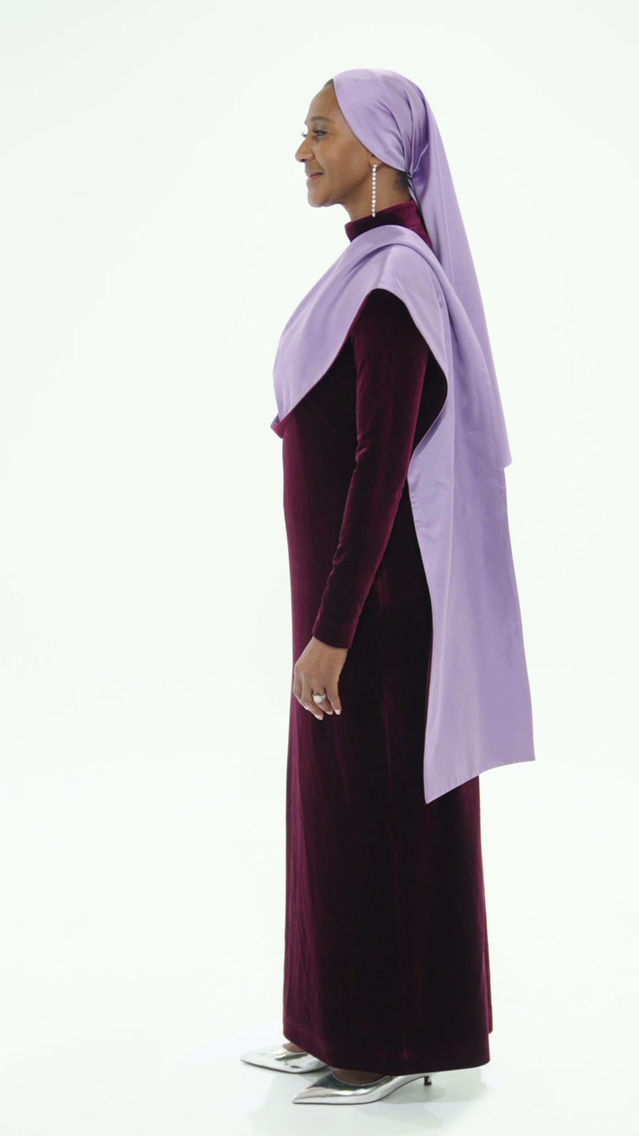 An attached, adjustable two-sided shawl defines the design—crafted in velvet on one side and satin on the other, allowing the piece to be draped around the body in multiple ways. Finished with a center-back invisible zipper and a subtly flared hem, the dress moves with softness while maintaining structure.