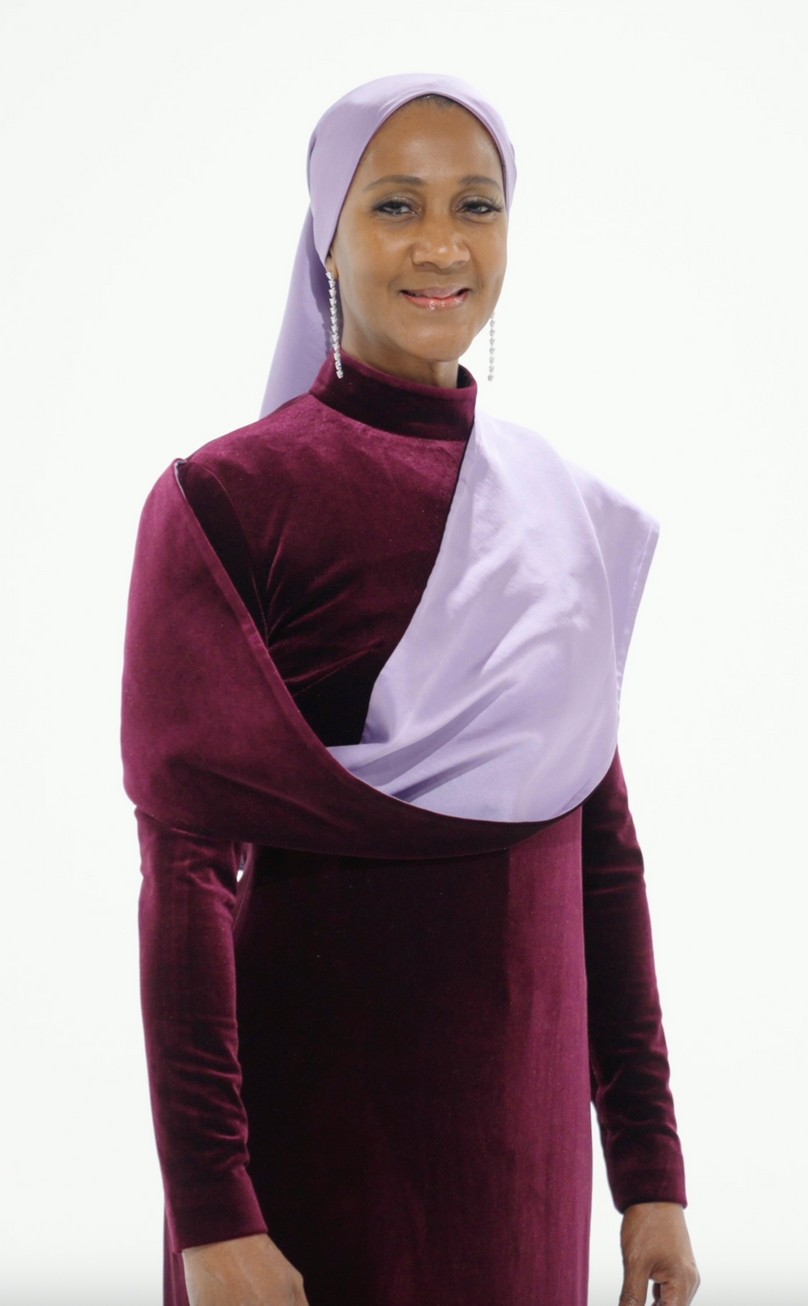 An attached, adjustable two-sided shawl defines the design—crafted in velvet on one side and satin on the other, allowing the piece to be draped around the body in multiple ways. Finished with a center-back invisible zipper and a subtly flared hem, the dress moves with softness while maintaining structure.